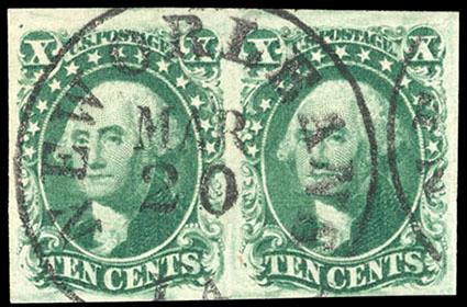 1855, 10¢ green, type II. An outstanding used horizontal pair, bright and fresh with large margins to barely shaved at lower right; socked-on-the-nose by a clear balloon-type "New Orleans, La., Mar 20" c.d.s., Very Fine, with 2004 P.S.E. certificate. Scott No. 14; $310. US$0 (Image)
