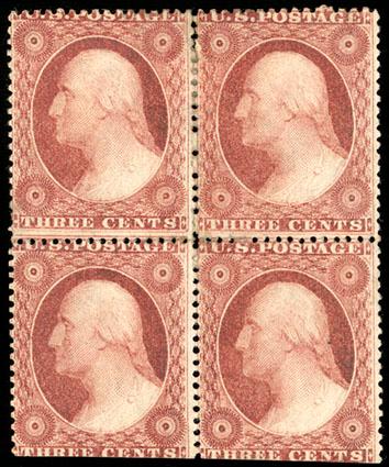 1857, 3¢ rose, type I. Block of 4, disturbed o.g., strong color; perfs clipped at bottom and some reattached perf separations, Fine appearance, a very rare mint multiple. Scott No. 25; $16,000. US$0 (Image)