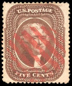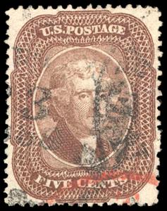 1859, 5¢ brown, type I. Cancelled with black and red postmarks, well centered, Very Fine to Extremely Fine, with 2024 P.S.E. certificate Graded (VF-XF 85, SMQ $625). Scott No. 29; $325. US$0 (Image)
