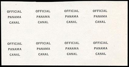 Canal Zone, 1941-47 "Official Panama Canal" overprint proofs, types 1 & 2. Used on most Official issue (except O8), type 1 with block of 8 and vertical pair and a type 2 single, on soft thin bond paper, also includes a block of 24, block of 4, vertical pair and single proof of the 1951 "Cristobal, Canal Zone" precancel on hard bond, Very Fine. Scott No. O1P, O3P; Estimate $200 - 300. US$200-300 (Image)