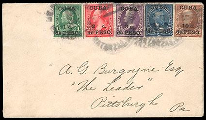 Cuba, 1899, 10c on 10¢ Webster, type I. In combination with 1899, 1c on 1¢ yellow green + 2c on 2¢ reddish carmine + 3c on 3¢ purple + 5c on 5¢ blue (221-222, 224-225) on cover to Pittsburgh, Pa., all tied by "Military Station 27 Matanzas, Cuba" cds's, Very Fine,ex-Plass. Scott No. 226; Estimate $150 - 200. US$150-200 (Image)