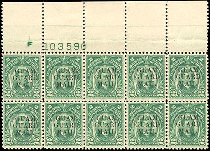 Guam, Guard Mail, 1930, 2¢-4¢ Issues complete. Plate block group consisting of 2¢ right margin plate no. "103589" block of 6 and top margin plate no. "103590" block of 10 (crease in margin), 4¢ corner margin plate no. "44873" block of 12 and top and right margin plate no. "44876" blocks of 6, o.g., F.-V.F. or better. Scott No. M5-M6; $520. US$0 (Image)