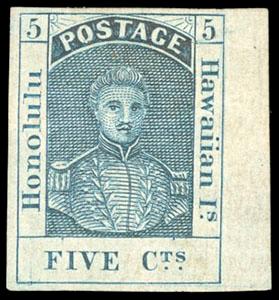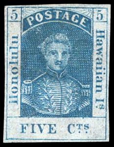 Hawaii, 1861, King Kamehameha III, 5¢ blue on thin bluish wove paper. O.g., full balanced margins, rich color, Very Fine. Scott No. 9; $400. US$0 (Image)