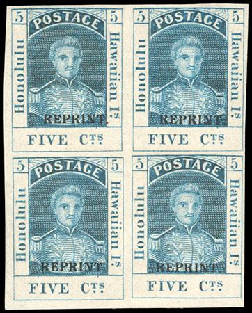 Hawaii, 1889, King Kamehameha III, 5¢ blue, overprinted "Reprint". Block of 4, full o.g., ample to large margins, bright and very fresh, Very Fine, a choice multiple. Scott No. 10RSC; $275. US$0 (Image)