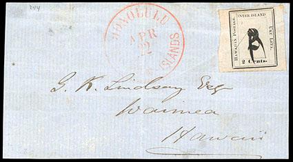 Hawaii, 1863, Numeral, 2¢ black on grayish. Plate 3-G-II, four mostly huge margins, light pre-use crease, tied on folded letter to Honolulu by manuscript and addressed to Haolelea (married to granddaughter of Kamehameha I), Very Fine & a nicely margined Numeral,ex-Golden. Scott No. 16; $5,000; Estimate $1,500 - 2,000.