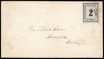 Hawaii, 1863, Numeral, 2¢ black on grayish. Plate 3-E-VIII, four mostly large margins with manuscript cancel on cover front to Waimea, postmarked red Honolulu postmark alongside, Extremely Fine,ex-Wilcox, with 1985 P.F. and 2000 Goldberg certificates. Scott No. 16; $5,000 as full cover.