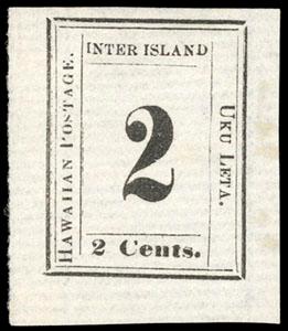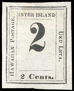 Hawaii, 1864, Numeral, 2¢ black. Plate 7-A, type IX, position 9, no gum, large margins, purple handstamp on reverse slightly shows through, otherwise Extremely Fine. Scott No. 24; $350. US$0 (Image)