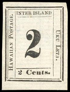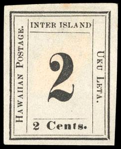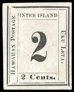 Hawaii, 1863, Numeral, 2¢ black on blue gray. Plate 5-A, type II, position 2, small portion of town cancel (appear to be a San Francisco transit postmark); repaired with portion of right margin added, Fine appearance, still a rare used example of this Numeral issue. Scott No. 18; $6,000. US$0 (Image)