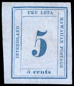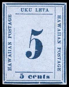 Hawaii, 1865, Numeral, 5¢ blue on blue. Plate 9-A, type VII, position 3, no gum, clear margins, fresh and Fine. Scott No. 21; $900. US$0 (Image)