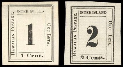 Hawaii, 1864, Numeral, 1¢ & 2¢ black. Plate 8-A, type X, position 9 & position 7-A, type II, position 2, no gum, mostly large margins; 1¢ with couple tiny shallow thins, otherwise Very Fine. Scott No. 23-24; $700. US$0 (Image)