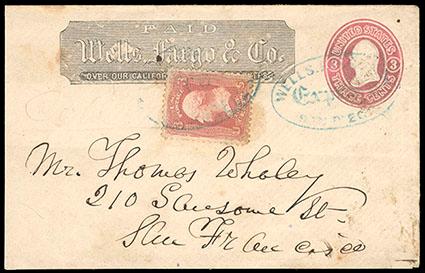 Symbol:Wells, Fargo & Co. Group Lot. Lot of 26 covers (mainly 3¢ entire all additionally franked with 1861 3¢ rose, however a few are Wells, Fargo & Co. usage franked with only 1861 3¢), one is a legal size paste up from Virginia City, N.T., condition is rough, however a few nice covers are included, please see our website for images. Estimate; $750 - 1,000.