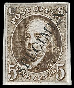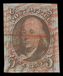 1847, 5¢ dark brown. Large margins all around, deep rich color and intermediate impression, red New York square grid cancel and part of red London "COLONIES/&c. ART. 13" Anglo-French framed accountancy handstamp, vivid red strikes fill up the stamp, Extremely Fine and striking, this marking is rarely found canceling the stamp, ex-Stollnitz, Dr. Morris, with 1974 and 1996 P.F. certificates. Scott No. 1a; Estimate $1,000 - 1,500. US$1,000-1,500 (Image)