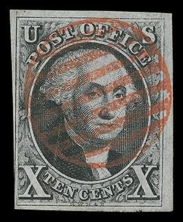 1847, 10¢ black. Large to huge margins except shaving frameline at lower left, vivid red circular 7-bar grid cancel, F.-V.F. and attractive. Scott No. 2; $850. US$0 (Image)