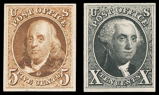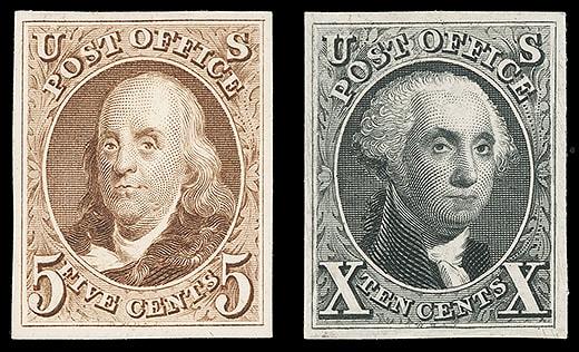 1847 (1875 Reproductions), 5¢ to 10¢ complete, plate proofs on card. 5¢ large margins, 10¢ large margins to just clear at bottom, detailed impressions, from the 2nd printing of 1882 originally accompanying distribution envelope, F.-V.F. Scott No. 3P4-4P4; $500. US$0 (Image)