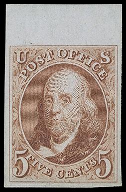 1847 (1875 Reproduction), 5¢ red brown. Without gum as issued, large to huge margins including wide top sheet margin, radiant color, Extremely Fine, with 2019 P.S.E. certificate graded (XF 90, SMQ $1,400). Scott No. 3; $1,000. US$0 (Image)