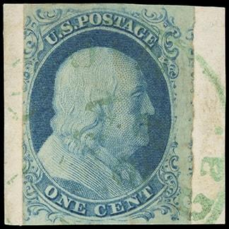 1851, 1¢ blue, type II. Position 41L1E, large to huge margins except slightly in at left, tied by green Georgia town cancel on small piece, F.-V.F. and rare true green cancel on the 1¢. Scott No. 7; $550. US$0 (Image)