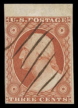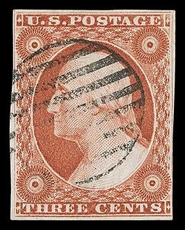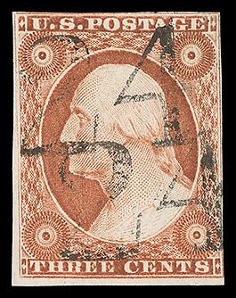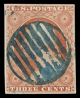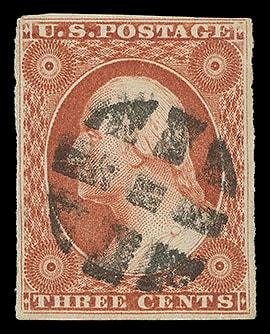 1851, 3¢ orange brown, type I. Position 79R1E, three large margins, canceled by beautiful red "Paid 3" in Circle (Skinner-Eno PM-PNc 17) cancel overstruck with black circular grid; light creases and tiny tear at bottom, Very Fine appearance,a rare red strike of the "Paid 3" marking. Scott No. 10; $175+; Estimate $200 - 300. US$200-300 (Image)