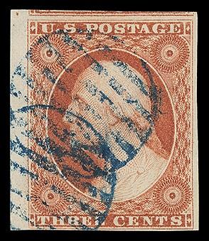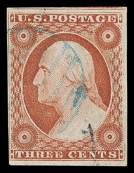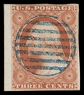 1851, 3¢ orange brown, type I. Position 31R1i, left center margin single with huge wide margins, touched at top, attractive blue circular grid centrally struck. Scott No. 10; $205. US$0 (Image)