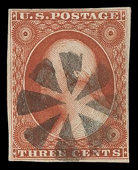 1851, 3¢ orange brown, type I. Position 18R1E, large margins, rich color, neat nine-section circular grid fancy cancel, Very Fine. Scott No. 10; $200. US$0 (Image)