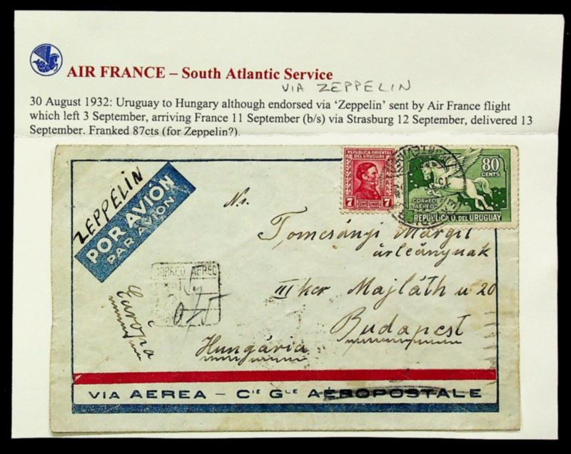 Uruguay 1932 2v on Air France-South Atlantic Service Zeppelin airmail Regd cover from Montevideo to Budapest Hungary (Image)