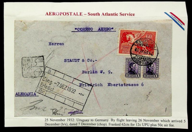 Uruguay 1932 3v on Aeropostale-South Atlantic Service cover from Montevideo via Paris France to Berlin Germany (Image)