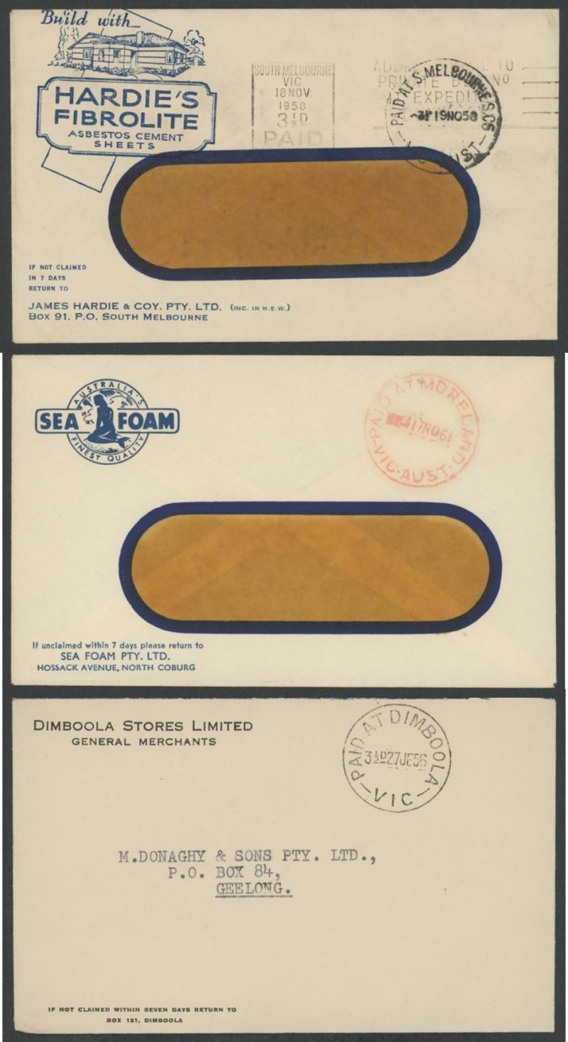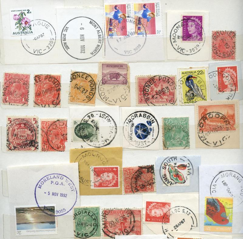 'PAID AT' 1930s-90s on cover accumulation comprising both machine cancels and CDS from early types in black with values to modern rubbers many scarce to rare, official & municipal mail, also advertising covers a few illustrated, good range with some duplication with quite a few from country towns including Bendigo, Broadford, Dimboola, Drouin, Kyneton, Mansfield, Mooroopna, Mornington, Nhill, Sale, etc, noted a few errors/inverted dateheads, thematic interest amongst the slogans, etc, strikes are mostly above average, condition variable but generally fine to very fine. Weighs 20kg. Ex Woodchip-Free Zone (Rod Perry).