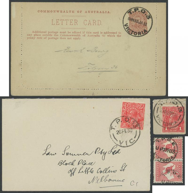 Travelling Post Offices untidy collection with strength in the Commonwealth period & mostly on KGV Heads including scarce 'DOWN' types 'TPO 3' (two different), 6 9 11 14 & 19 (two different) and scarce 'TPO E' on 1d Kangaroo pair, also covers with 'UP' types 'TPO 3' 4 6 9 17 & 19, superb 'TPO 3/DOWN 10JA13/...' on Fullface 1d Letter Card, and very fine 1930 'TPO 13/VIC', lots of duplication in the lesser material.