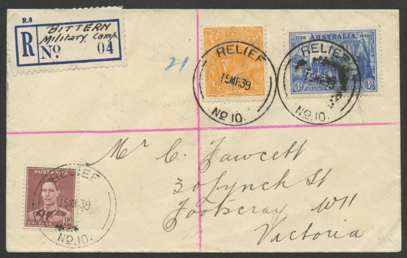 Bittern Military PO: 'RELIEF/15MR39/No 10.' cds three very fine complete strikes on philatelic cover with 'BITTERN Military Camp' manuscript on provisional R label, 'BITTERN/16MR39/VIC' transit backstamps. PO 28.2.1939; closed 27.3.1939 - one month only. [Mornington Peninsula]. A similar example but with a handstamp on the provisional R label sold at our auction of 1.9.2018 for $248 (Sale 229 Lot 685). (Image1)