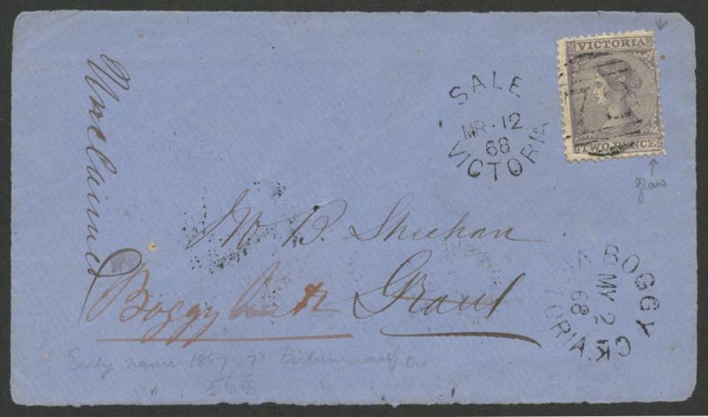 Boggy Creek (1): 'BOGGY CK/MY 2/68/VICTORIA' cds largely very fine arrival on cover front Sale to Grant and re-directed, a couple of minor blemishes. Replaced Merrijig (1) PO 10.7.1867; renamed Bulumwaal 1.1.1871 [Victorian Alps]. Recorded used only in 1868. (Image1)