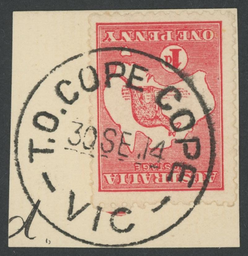 Cope Cope: 'T.O. COPE COPE/30SE14/VIC' cds (WWW110; recorded February 1914 to December 1916 only; rated RRR) magnificent strike on Kangaroos 1d red on-piece. PO 15.9.1873; closed 31.10.1975 [Central Goldfields; 25km NW of St. Arnaud]. Oh that all postmarks looked like this. (Image1)