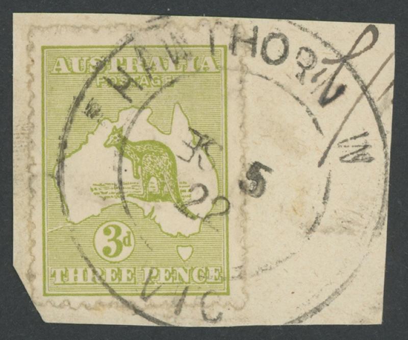 Hawthorn West: 'HAWTHORN W/SE 5/22/VIC' double-circle skeleton relief cds ('SE' slug inverted) largely very fine complete strike on Kangaroos 3d olive on-piece. A new discovery & the only example recorded. Virtually all the skeleton reliefs are notoriously elusive even as part-strikes. (Image1)