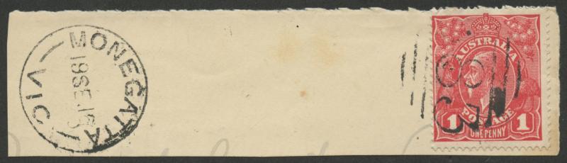Monegatta: 'MONEGATTA19SE16/VIC' cds (25mm; unrecorded by WWW) very fine complete strike alongside KGV 1d red tied by light but largely fine Barred Numeral '583' on-piece. Renamed from Duck Holes PO 21.4.1875; renamed North Monegeeta 10.9.1917, the same day South Monegeeta PO was renamed Monegeeta [Grampians; 5km S of Romsey]. WWW records a 23½mm unframed cds only, with dates from 1889 to late-1915, so this new discovery was used for only a very short period of time. (Image1)