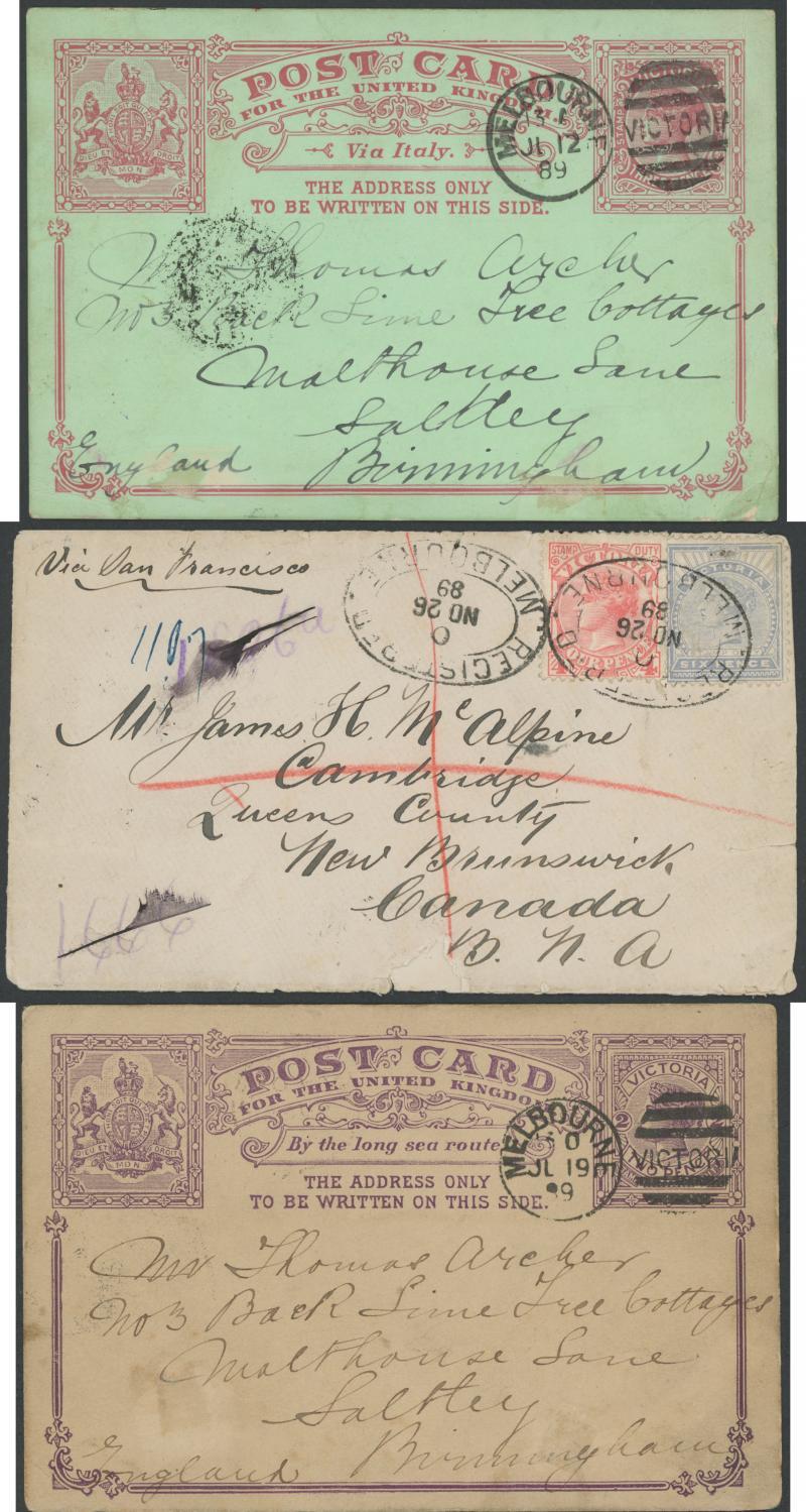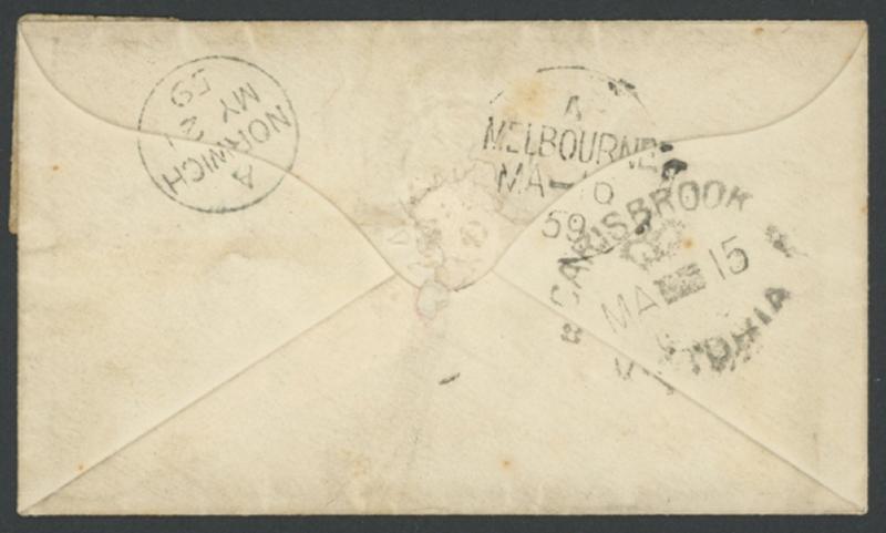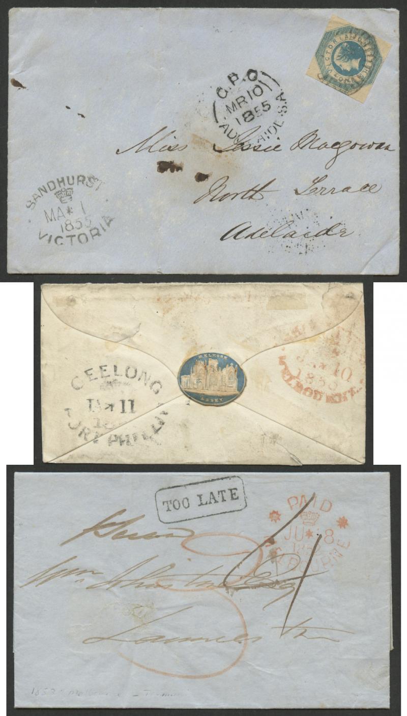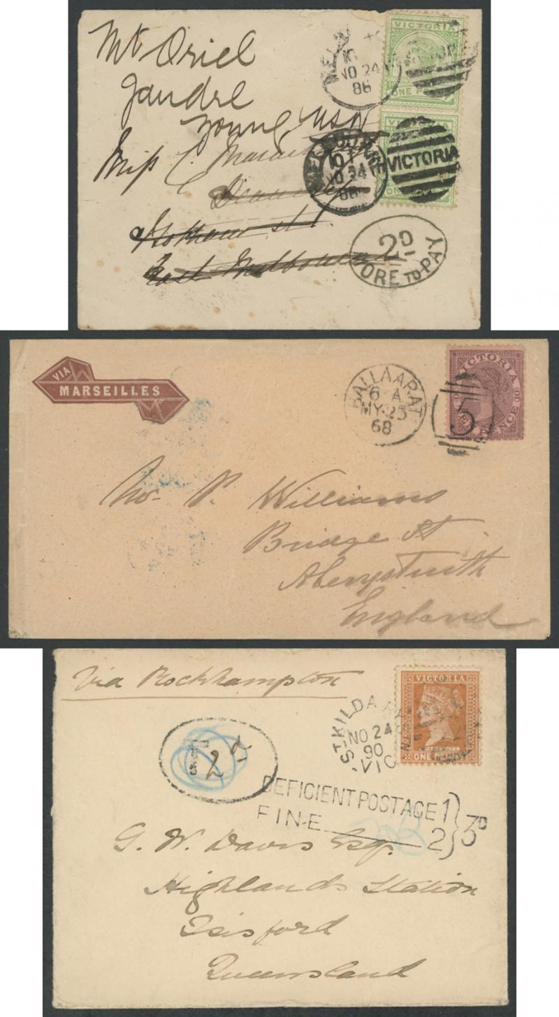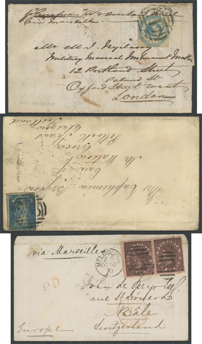 Consignment remainders comprising 1) 1854 double-rate entire to London "via Marseilles" with fine oval 'PAID/[crown]/MELBOURNE' datestamp in red & rated "4/1" on arrival; 2) 1854 stampless from GB "Per John Perry" via Singapore then P&O 'Madras' (record voyage of 61 days); 3) similar per General Screw 'Lady Jocelyn' with 'T.P/East Sheen' backstamp in blue, this & previous both pre-paid "1/-" in red & with light 'SHIP LETTER/FREE/GPO VICTORIA' arrival b/s in red; 4) 1859 to Norfolk "per Emeu" via Mauritius with crowned-oval 'CARISBROOK' backstamp, the ship had mechanical problems mid-ocean; 5) 1866 mourning cover from GB with 1d x6, scarce 22mm 'GEELONG' (unusually in red) & 'WICKLIFFE' transits & poor Warrnambool arrival, unusually overland from Geelong; and 6) 1883 OHMS cover with 'PUBLIC LIBRARY, MUSEUM/AND/NATIONAL GALLERY OF VICTORIA' imprint at lower-left, Chief Secretary Frank in rosine but no postage paid as required for overseas mailing.