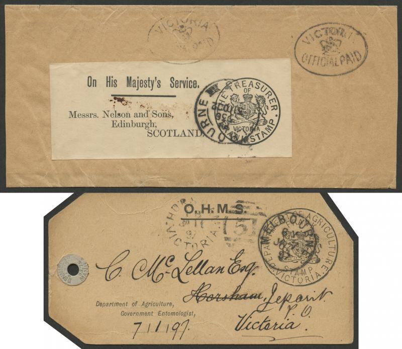 Frank Stamps including 1874 'COMMR OF RAILWAYS & ROADS' handstamp in red (Stieg & Watson rated RR) on OHMS envelope (faults), 1890 'COMMR OF TRADE & CUSTOMS' handstamp in red (R; LRD) on OHMS envelope from Wodonga, 1891 '...WATER SUPPLY' on wrapper (closed tear), 1892 'GOVERNOR...' handstamp in violet on long envelope to "Admiral Lord Charles Scott" on the HMS Orlando at Sydney, 1895 Chief Secretary on Government Botanist OHMS label on parcel to Edinburgh endorsed "Samples Only", 1897 Agriculture on OHMS parcel tag (corner clipped clear of Frank) to Horsham re-directed to Jeparit, 1902 Treasurer on OHMS label on wrapper to Scotland with 'VICTORIA/[crown]/OFFICIAL PAID' handstamp alongside, condition a little variable but many are fine to very fine.