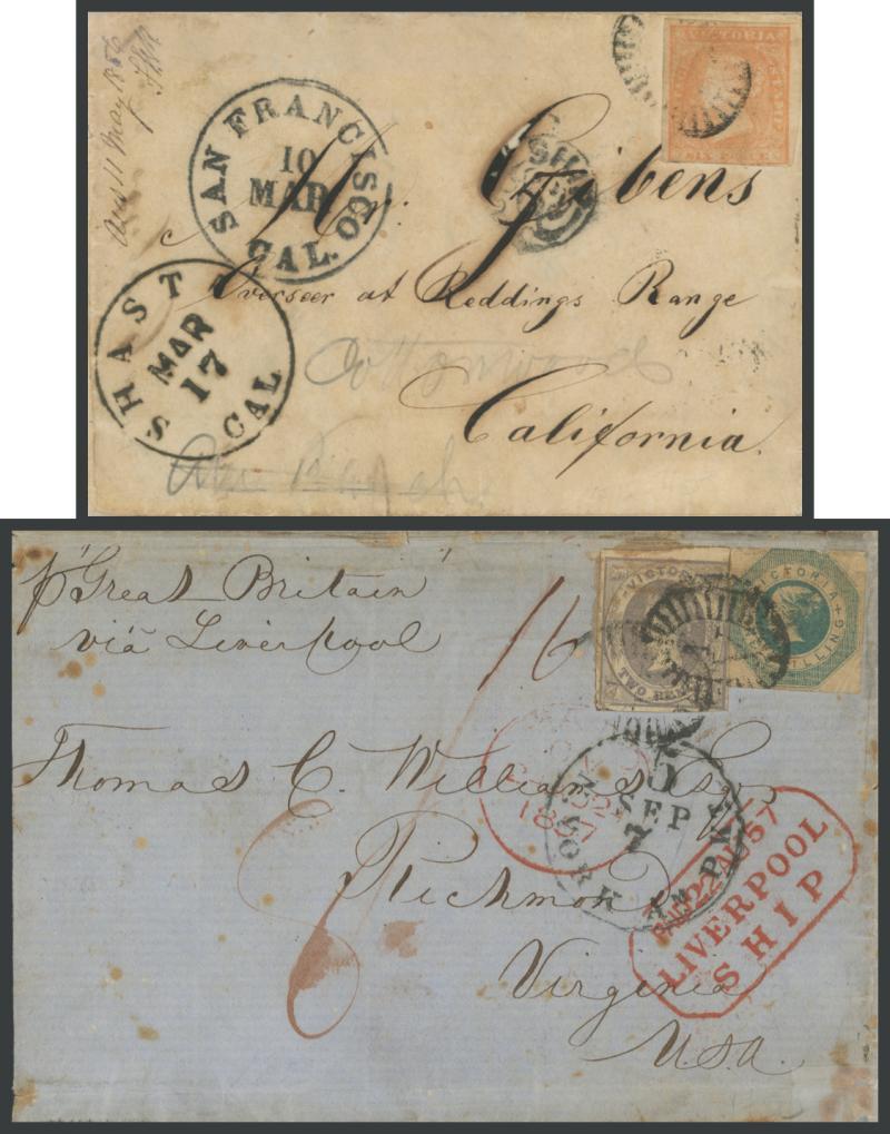 1854-71 mail to America comprising 1) 1854 (Nov 11) stampless entire endorsed within "pCalcutta/via Southampton" via Cape Horn to London then per 'Asia' to Boston where it entered the mails with arrival cds of FEB/17' on the face, very fine; 2) 1855 (Oct 12) trans-Pacific entire from a California "49er" goldminer now at Ballarat to "Reddings Range/California" (goldmining area 260km N of Sacramento) with superb San Francisco transit of 10/MAR & 'SHIP/ 6 ' clamshell handstamp corrected to "5" and largely superb 'SHASTA/MAR/17/CAL' arrival cds, extensive splitting/reinforcing; 3) 1857 (May 20) large-part entire to Virginia "p Great Britain/via Liverpool' with Emblems 2d + Shilling Octagonal, superb strike of the rare 'PAID 22AU57/LIVERPOOL/SHIP' transit in red on the face (used for one day only, & stated to be the only recorded example from Australia to America), some soiling & repairs; 4) 1869 cover with Laureate 6d to London from where redirected to "Troy/New York" with 'NEW YORK/JUL/17/US 22 NOTES' depreciated currency cds; and 5) 1871 (Jan 3) cover to Vermont (a rare destination) "via Southampton" with London transit, Boston arrival & '2/CENTS' handstamp all in red, with the enclosed letter commenting on the "awful [Franco-Prussian] war they are having in Europe" (like it's a weather event!). Terrific items but in sub-optimal condition. Ex Dale Forster. [See also USA-Australia covers Lot 2314].