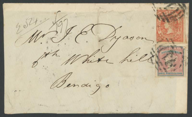1855 Dyason Correspondence front to "6th White Hill/Bendigo" with Imperf Emblems 4d vermilion (three large margins) & 'REGISTERED' 1/- full margins except where touched at upper-right tied by BN '1' of Melbourne. [Goldmining: the "white hills" were mullock heaps that gleamed in the sun] (Image1)