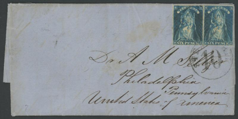 1859 (Nov 21) entire to "Philadelphia/Pennsylvania" with the lengthy letter headed "Running Creek Saw Mills near Melbourne" and signed "Thos B Swift", Queen-on-Throne Rouletted 6d pair with faint BN '1' of Melbourne (backstamp of DE1/59) & tied by 'STEAMSHIP/ 10 ' handstamp of New York, minor blemishes. Ex Dale Forster who concluded that it was carried trans-Pacific to Panama, across the isthmus by rail, then by ship to New York: a rare routing. [We have never encountered the Running Creek Saw Mill and online searches were fruitless. The letter indicates it was located at Kew, about 5km E of Melbourne] (Image1)