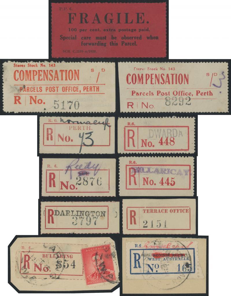 Registration labels collection on leaves some on pieces with stamps tied by matching datestamps plus complete & Registration Envelopes x30+, noted plenty of early red/whites including small types 'BARABUPP', 'BEJCORDING' on-piece with KGV 2d & 3d tied 'TOODYAY' cds, 'Belmont Sth', 'BULLARING' with cds, 'DARLINGTON' handstamp on blank label x2, 'DINNINUP', 'ESPERANCE BAY', 'GILLINGARRA', 'KENDENUP', 'KORRELOCKING' with cds, 'MOOLIABEENIE', 'NAMBAN', "Nornalup" manuscript on 'PERTH' label, 'NORTHAM' endorsed "West" in manuscript, 'PAYNES FIND', 'PEAK HILL' alongside KGV 5d brown tied cds, "Reedy" manuscript on 'CUE' label, 'TERRACE OFFICE', 'WHIM CREEK', 'ZANTHUS', etc, plus more provisionals (25+), large types with ornate 'R' for Albany, Fremantle, Northam & Perth plus blank with 'BUNBURY' handstamp, and with plain 'R' for Dongarra, Esperance, Midland Junction, Mundaring, Mundiwindi, New Norcia plus provisonals (14) and a strip of 3 unused blanks, later blue & black/white and blue/white types with lots of provisionals with either manuscript town names or cachets including Albany North (with 5½d Emu tied cds), Boonie Rock with name crossed out and replaced by "Coogee Beach" in red ink (tied by 'COOGEE BEACH' cds), Brentwood (with QEII 1/7d tied 'RELIEF No.7' cds), Deepwater Point (with cds on label & stamps alongside), Ingleton (with cds alongside), Wyening (with KGVI 1½d green x 2 & 2½d red tied cds) and many more, also a few Military Post Offices, plus Parcels Post Office Perth 'COMPENSATION' labels x7, generally fine to very fine. The most wide-ranging group of such material we have offered.