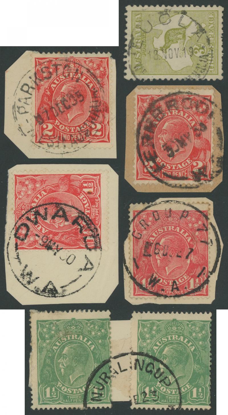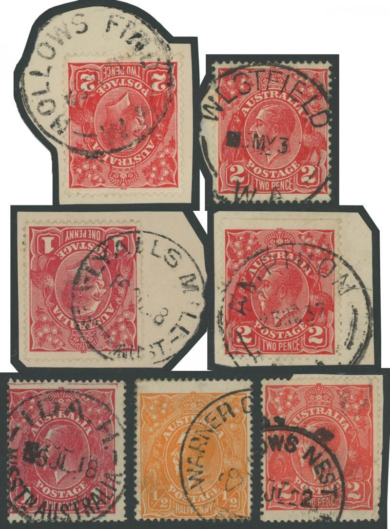 Datestamps on KGV Heads apparently all-different selection of above-average strikes with many closed offices and plenty of scarce items including Amphion, Bamboo Creek, Barrabupp (two 'P's), Berkshire Valley, Boodarockin, Bungulla, Bunjil, Burbanks, Burbidge, Burtville, Bushlanding Dwellingup, Claymore, Corinthian, Doorawarrah (violet), Dwarda, East Kirupp, Eyre, Field's Find, Georgina, Golden Ridge, Goongarrie, Granite Hills, Gnows Nest (partial), Hoffmans Mill, Holdens, Hollows Find, Ida H, Jourdie Hills, Kunjinn (two 'N's), Linden, Lion Mill, Lyalls Mill, Lyons Camp, McLeods Creek (partial), Mollerin on piece with provisional R label, Mount Kokeby (blue), Mount Palmer, Nalkain, Narngulu, Nevoria, Nillup (partial), Nippering, State Mills No.1, No.2 & No.4, No.7 Pumping Station (superb), Noman's Lake (partial), Noongaar, Oldbury, Paynesville, Protheroe (large-part), Quinn's (doubled), Red Lake, Rosa Brook, Roslyn Farm, Rossmith ('23NO26' partial in blue; LRD), Round Hill, South Kalgoorlie (violet), Swan View, Toolibin, Treesville, Waddington, Warners Glen (partial), Wellard, Westfield, Whittakers Mill, Yarri (second opening 1936-43 only), Young's Siding, Yuin, etc, condition generally fine to very fine.