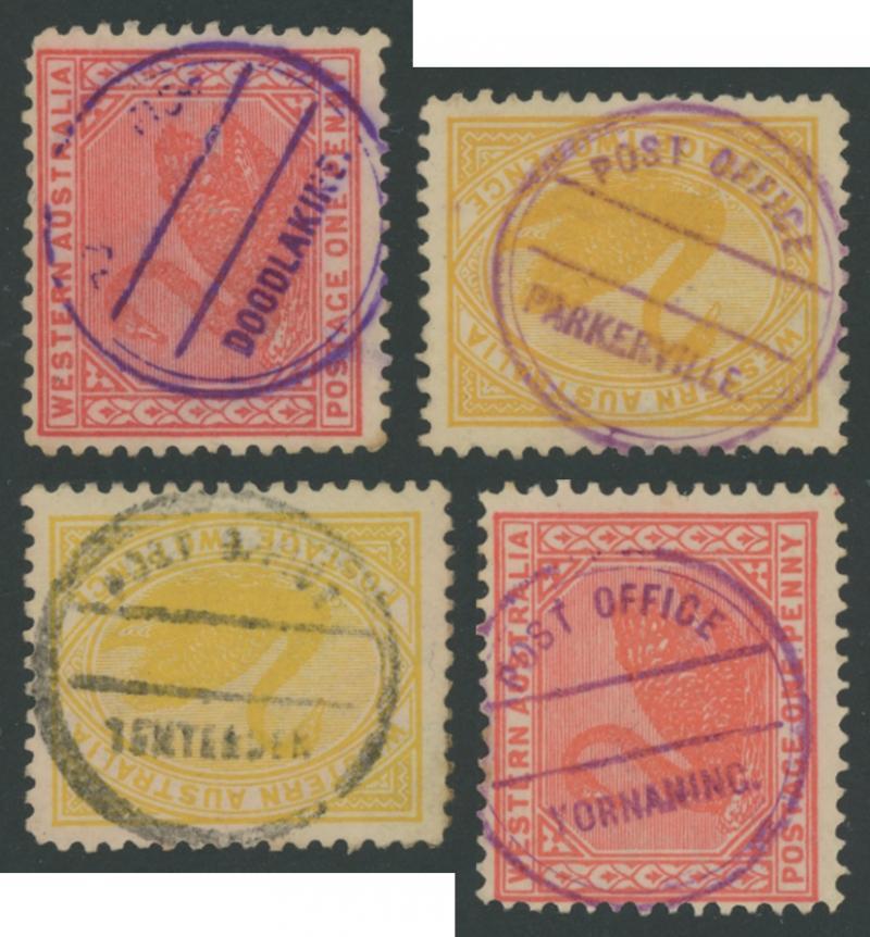 'POST OFFICE' double-circle undated handstamps complete or virtually complete fine to very fine strikes of 'DOODLAKINE' on Swan 1d pink in violet, 'PARKERVILLE' on 2d yellow in violet, 'TENTERDEN' on 2d yellow in black, and 'YORNANING' on 1d pink in violet, very scarce. (4) (Image1)