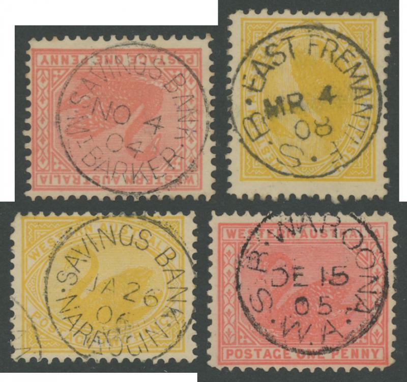 Savings Bank datestamps on Swans group including Broome, Broome Hill x2, Chidlows Well in violet, Collie x2, East Fremantle, Greenough, Kojonup x6, Malcolm, Merredin x2 (one in violet on piece), Mount Barker x2, Mount Morgans, Nannine, Narrogin, Ravensthorpe and Waroona x10+, these generally fine to very fine large-part to complete strikes, plus partial strikes including '.../[MAL]COLM', '.../MORG[ANS]', etc.