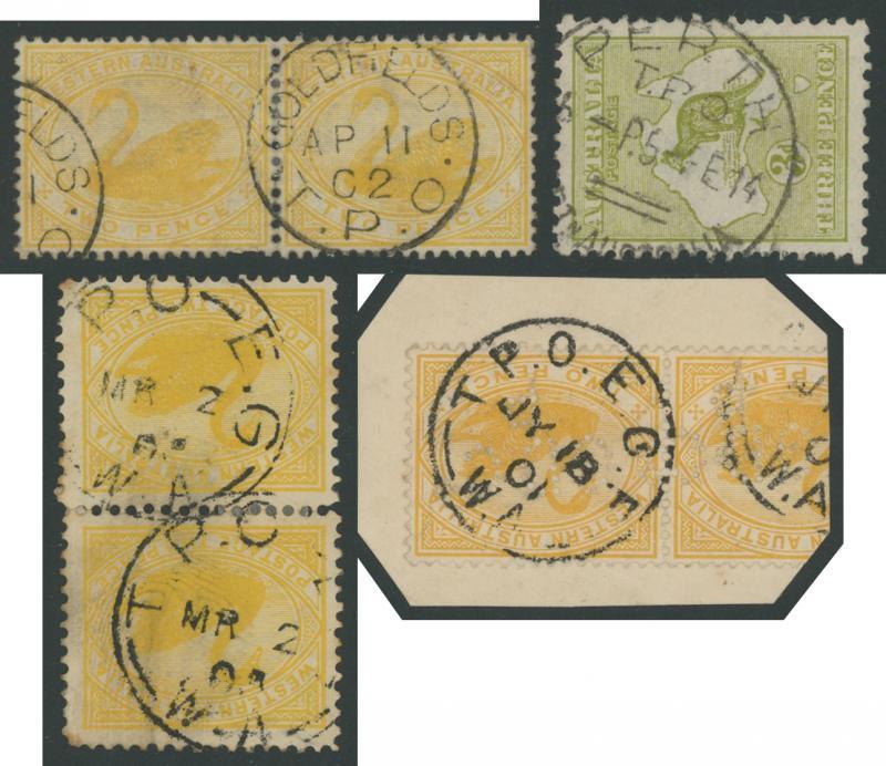 Travelling Post Offices Datestamps selection including'GOLDFIELDS/T.P.O' very fine complete strike on Swans 2d yellow pair and two bold largely very fine strikes on Swans 1d red & 2d yellow on-piece, Eastern Goldfields 'T.P.O.E.G.F' very fine complete strike on Swans 2d yellow on-piece plus a range of partial strikes and 'T.P.O-E.G' very fine almost complete strike on Swans 2d yellow pair, Perth TPO large-part strikes on Swans 2d yellow 'ONE PENNY' overprints x3 on-piece and on Kangaroos 1d red & 3d olive, also Great Southern Railway 'G.S.R.' at base x3 part-strikes, generally fine to very fine.