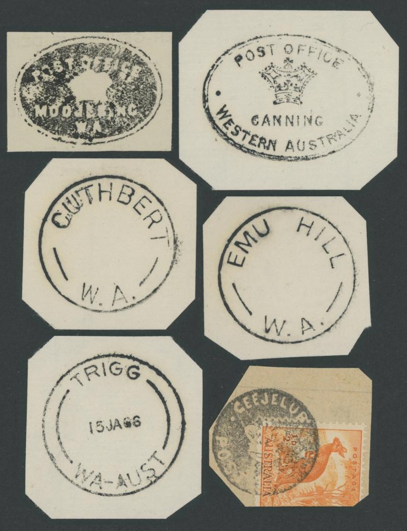 Archival & per favor strikes on pieces (no stamps) lightly duplicated group including early undated crowned ovals of Australind and of Canning x2, Mail Bag Seals of 'MOOJEBING' (oval) on-piece and of 'GEEJELUP' (round) x2 and a page annotated "old post office stamps held in the GPO Perth" with Australind crowned chamfered box, Cheangwa mail bag seal, etc, also Commonwealth-era datestamps Chorkerup, Cuthbert (no dateline), Emu Hill (no dateline), Flinders Bay, Kent River, Kulyalling, Kundip (two different types), Kunjin (final 'N' excised), Noman's Lake, Northam North, Old Collie Bridge, Trigg ('15JA66' SDL; closing day), Wellington Dam, Yanmah (two different types), and plenty more, some light duplication, the strikes generally very fine. A number of these have the same dates (or are the same markings) as those illustrated in PMI.