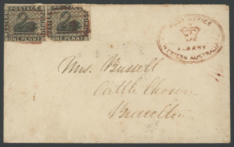 Albany: 'POST OFFICE/[crown]/ALBANY/WESTERN AUSTRALIA' double-ring undated handstamp largely very fine strike in dull red alongside 1854 Recess 1d black SG 1 pair (margins good to touching; both with surface faults) tied by two light but discernible strikes of Numbered Grid '14' in the same ink, on envelope to "Mrs Bussell, Cattle Chosen, Busselton", no arrival markings. Not listed in the Pope & Reynolds Census of Numeral covers. The heritage-listed homestead 'Cattle Chosen' was the first residential building in the Bussellton district, built by John & Alfred Bussell -.4.1832. Presentable notwithstanding the faults, and rare: Cecil Walkely's very fine 1856 cover with 1d black x2 & 4d blue to South Australia - the Albany handstamp perhaps not quite as fine as here - sold at our auction of 27.11.2010 for $7762 (Sale 159 Lot 86). (Image1)