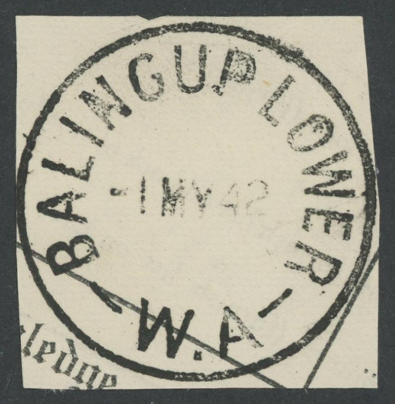 Balingup Lower: 'BALINGUP LOWER/-1MY42/W.A' cds very fine complete strike on PO form piece. TO 1.12.1926; RO ?; PO 1.7.1927; TO 16.10.1945; closed ? [Farming; 8km SW of Balingup]. PMI illustrates an archival strike with muddled dateline; no usage recorded. The original cds with the date set at '8MY24' was sold at a Perth auction in 2023 for $299. The provenance supports this being a contemporary strike. (Image1)