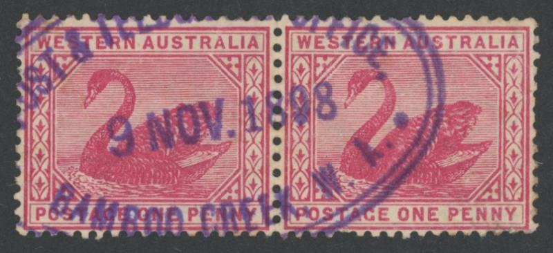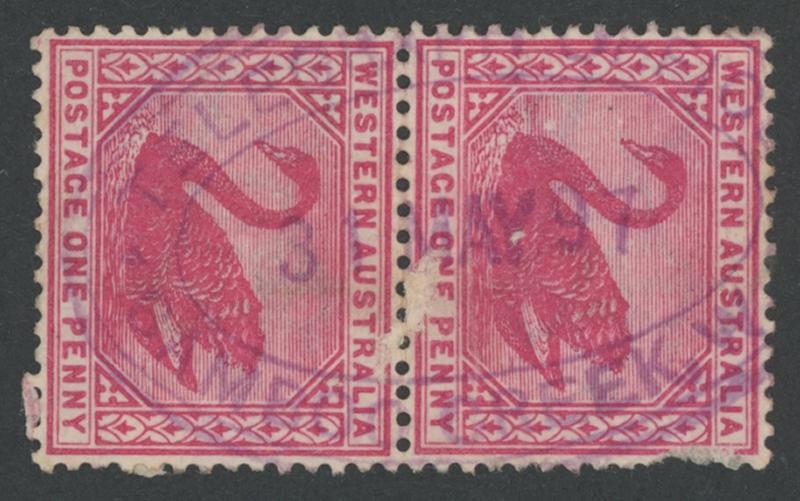 Bamboo Creek: 'POST & TELE[GRAPH] OFFICE/9 NOV. 1898/BAMBOO CREEK, W.A.' double-oval datestamp (ERD) superb large-part strike in violet on Swans 1d red pair. PO 19.2.1895; TO 31.5.1969; closed ? [Gold Mine; 88km E of Marbel Bar]. PMI Type ORS1, recorded May-Nov 1900 only. (Image1)