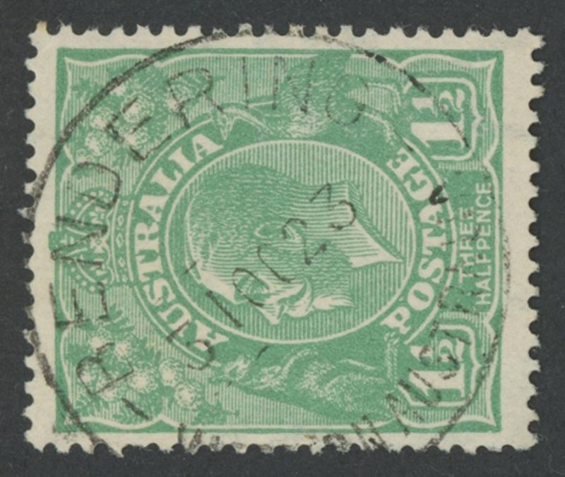 Bendering Siding: 'BENDERING/31OC23/WESTERN AUSTRALIA' cds (RO period) largely very fine strike on KGV 1½d green. RO 10.12.1921; renamed Bendering PO 1.11.1924; closed 15.12.1976 [Railway Siding; 35km SE of Corrigin]. PMI does not record any dates in this period, listing one 1926 strike only for this cds. A similar strike sold at a Perth auction in 2015 for $253. (Image1)