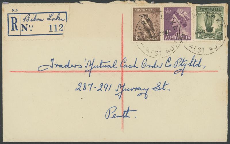 Bibra Lake: 'BIBRA LAKE/1-MY58/WEST-AUST' cds with small dateline three largely very fine complete strikes on-cover with provisional R label (manuscript), Fremantle transit & Perth arrival backstamps, a few closed edge tears. RO 20.6.1911; PO -.-.1912; closed 31.12.1958 [Farming; 11km SE of Fremantle]. PMI lists the Type Ea30 and states "requisitioned 6.8.1957", but records no dates; the first recorded usage. (Image1)