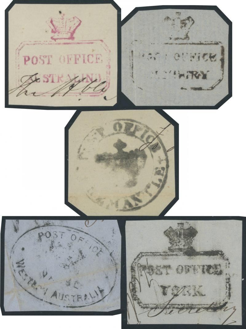 Early markings on contemporary pieces small group including 'POST OFFICE/[crown]/FREMANTLE' undated circle x3, Crowned Chamfered-Box handstamps of 'AUSTRALIND' (very fine in magenta), 'BUNBURY' and 'YORK' x4, also 'POST OFFICE/[crown]/VASSE/WESTERN AUSTRALIA' undated double-ring oval and similar from 'YORK' & 'ROCKINGHAM' (?), plus double-arc unframed datestamps of Albany, Bunbury x2, Champion Bay, Northampton & York, the quality of strikes is variable as usual but many are above-average and all are complete. Note: these are all actual usages, not archival strikes.