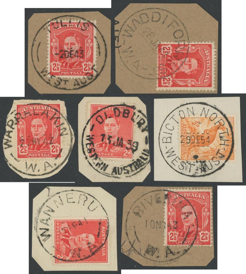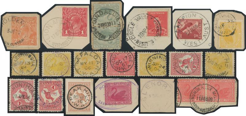 Substantial but rather disorganised datestamps collection mounted on leaves with lots of closed POs and scarcer items, mostly well above-average strikes lightly duplicated throughout, noted on Swans 'ABBOTTS', 'BARDOC', 'BEDFORDALE', 'BLACK RANGE', 'BOOGARDIE' x2 (one in violet), 'BOORABBIN' (superb), 'BROWN HILL', 'BULONG' large & small types, 'BURGES SIDING', 'POST OFFICE/CANNING MILLS WA' double-oval in violet, 'PARCEL [POST]/COOLGARDIE' double-oval in violet, 'CONDON' unframed & framed, 'CORINTHIAN' (also on 1d Kangaroo), 'DUKETON', 'EDJUDINA', 'EYRE', 'TELEGRAPHS/ FREMANTLE' cds (unrecorded by PMI) & 'P.O. CUSTOMS ...' (partial), 'GABANINTHA' (also on 1d Kangaroo), 'GEORGINA', 'GINDALBIE', 'GOONGARRIE', 'GULLEWA', 'HARRIS', 'HIGGINSVILLE', 'IDA H', 'ISRAELITE BAY' (two in blue), 'JOURDIE HILLS' (also on 1d Kangaroo), 'KALAMUNDA', 'LA GRANGE' (also on KGV ½d green), 'LAKE AUSTIN', 'LAKE DARLOT', 'LAKESIDE' (violet), 'LENNONVILLE', 'LUNENBURGH', 'MANINGA MARLEY', 'REGISTRATION BRANCH/MENZIES WA' double-oval in violet, 'MOGUMBER', 'MT SIR SAMUEL', 'MULWARRIE', 'MUNDIJONG', 'MURGOO' (violet), 'NEWLANDS', 'NIAGARA', 'NUMBER SIX MILL', 'PADDINGTON' large & small, 'POPANYING POOL', 'PRESTON VALLEY', 'PRINCESS ROYAL', 'QUINDALUP' 'ROUND HILL', 'THE GRANITES', 'TORBAY JUNCTION', 'TRAFALGAR', 'TUCKANARRA', 'WARRAWOONA' before & after temporary closure, 'WAVERLEY', 'WILGA' in violet, 'WINNING POOL' 1904 (ERD), 'WOODLUPINE', 'YOUANME', etc, then later strikes many complete on-piece including on Kangaroos & KGV Heads of 'BIBRA LAKE' (Type Ea30 SDL; previously unrecorded), 'BOKAL', BOOTENAL', 'BULLA-BULLING' framed, 'BUNJIL', 'BURBANKS', 'CALINGIRI' in violet, 'CAMPION' both types, 'CAVE HOUSE YALLINGUP', 'CITY BEACH' 1941 (early date), 'COPPERFIELD', 'DWARDA', 'HOLDENS', 'GLENORAN' in violet on PO form (no stamp), 'KENT RIVER', 'LINDEN', 'LION MILL', 'MANJIMUPP' (two 'P's), 'MARRINUP', 'MIDDLE SWAN' 1913 in blue (ERD), 'MOUNT PALMER', 'MT SIR SAMUEL', 'No1 STATE MILL VIA MANJIMUP', 'No2 STATE MILL DWELLINGUP', 'No4 STATE MILL', 'SIBERIA' on PO form (no stamp), 'WATERMAN'S BAY', 'WEST SUBIACO' x2 (one in blue), etc, condition generally fine to very fine. A fantastic opportunity to add to and/or upgrade your collection.